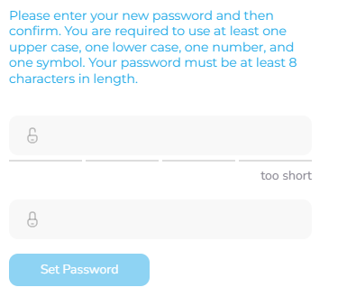 - Follow the rules and the “Set Password” button will enable. Click it and you’ll be forwarded to the login page to use your new password.